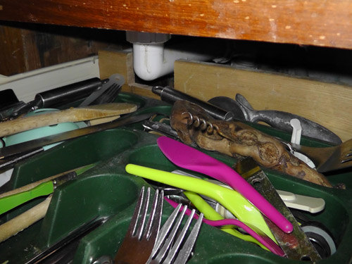 Paper waste/stool, fridge, hob, cooker, utensil draw and cupboard